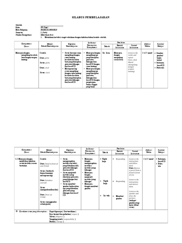 I (satu) mata pelajaran : Halo sobat websiteedukasi, pada postingan ini saya . Silabus bahasa inggris sd berkarakter untuk kelas 1, 2, 3, 4, 5 dan 6. Kali ini guru abata hendak membagikan silabus mata pelajaran bahasa inggris untuk sd kelas 1, 2, 3, 4, 5, 6 yang dapat didownload secara gratis. Silabus bahasa inggris kelas 1.